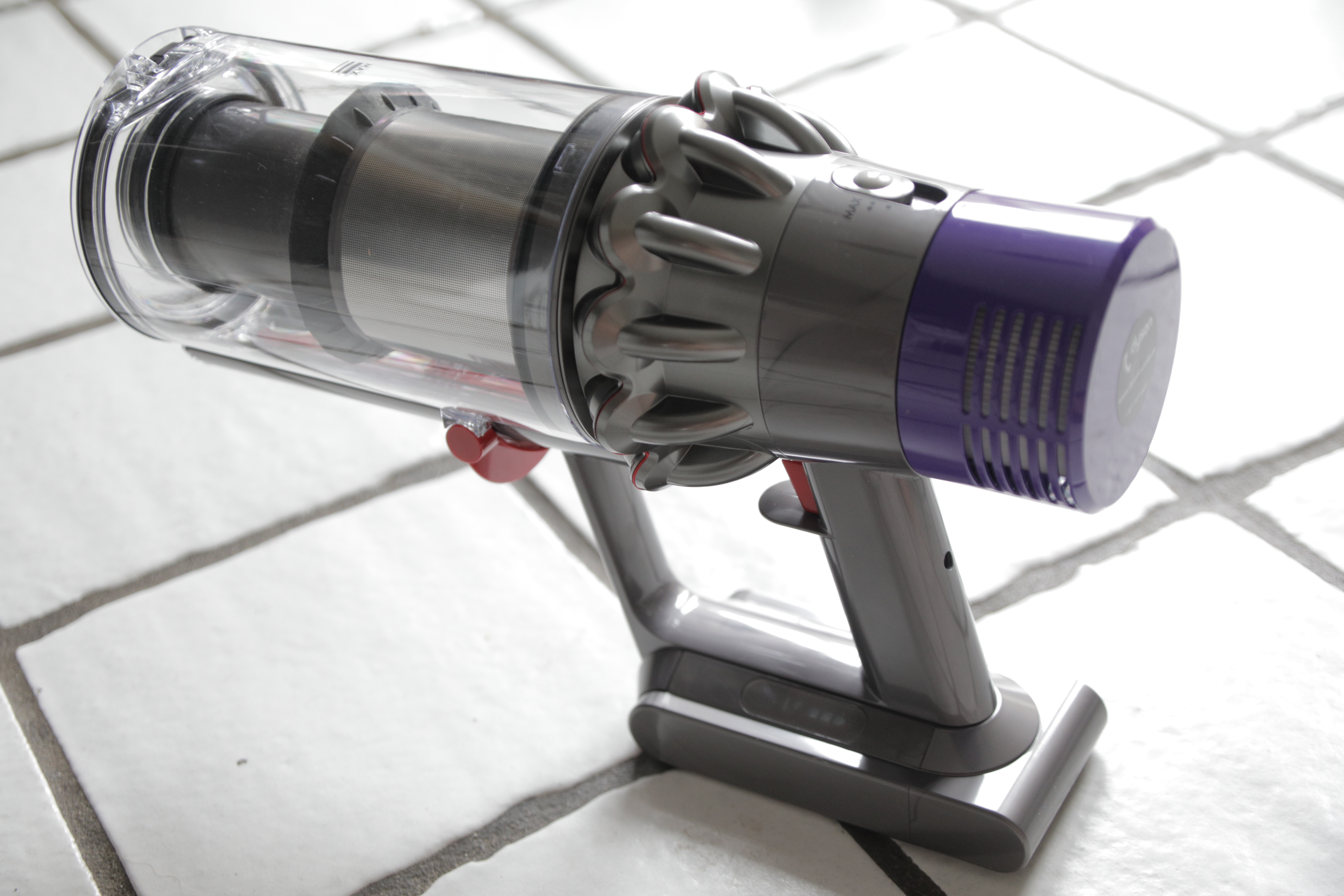 Dyson’s also done something terrific with the user interface on this machine, putting more info on the battery via simple LEDs. You’ll now see when there’s a blockage, for instance, and also be alerted when the vacuum detects that its single filter needs washing to restore full suction power. It seems like a small detail, but based on my past experience with Dyson’s vacuums, having a clear sign of when you should be cleaning those filters is actually a huge help.