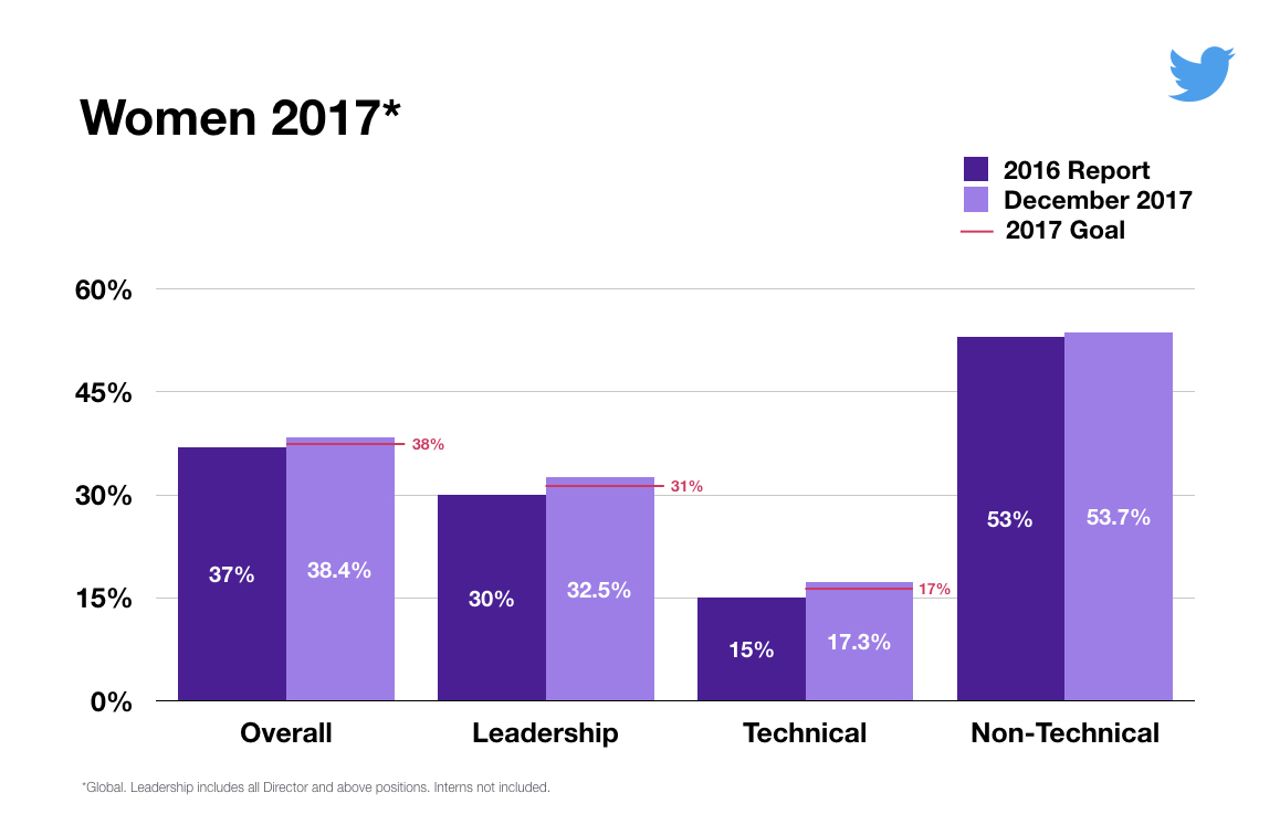 Twitter met or surpassed many of the diversity and inclusion goals it set for itself for 2017, the company announced today. Twitter is now 38.4 percent female, compared to 37 percent in 2016. Regarding underrepresented minorities at Twitter, representation increased from 11 percent in 2016 to 12.5 percent in 2017.