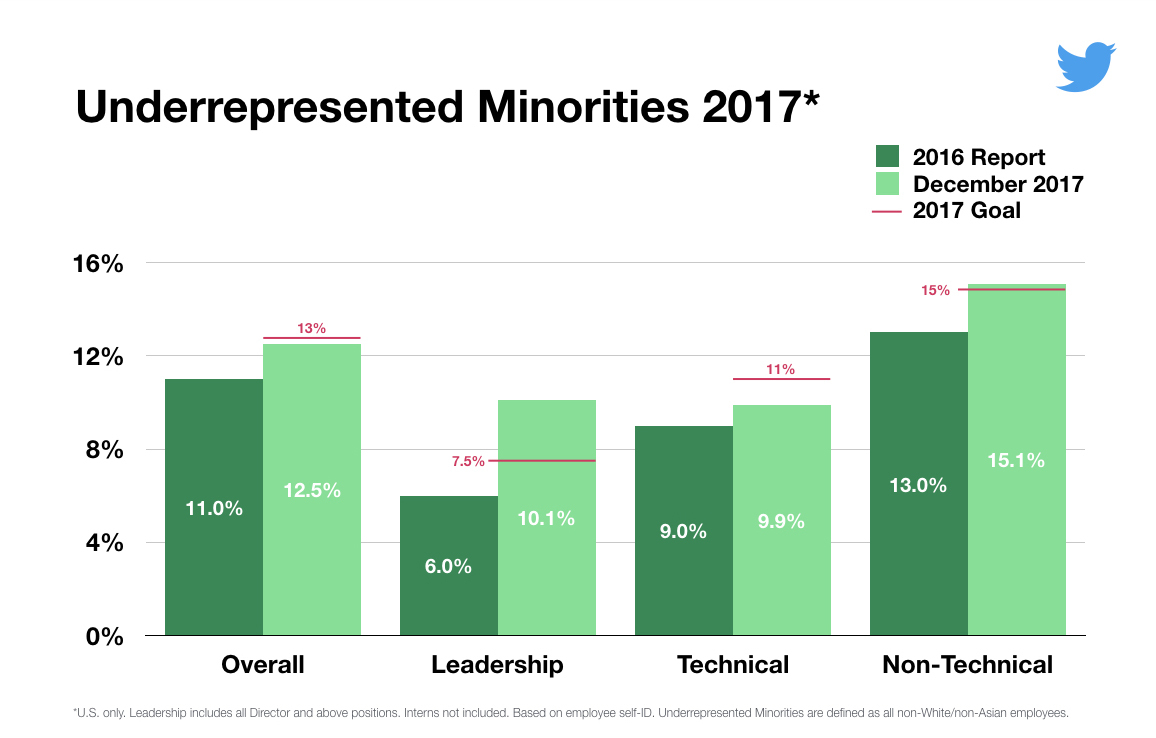 While Twitter increased the overall representation of women and underrepresented minorities, it missed its goals for overall representation of underrepresented minorities as well as underrepresented minorities in technical roles. At the leadership level, Twitter went from 30 percent female in 2016 to 32.5 percent female in 2017, and underrepresented minorities now account for 10.1 percent of employees at the leadership level, compared to just 6 percent in 2016.