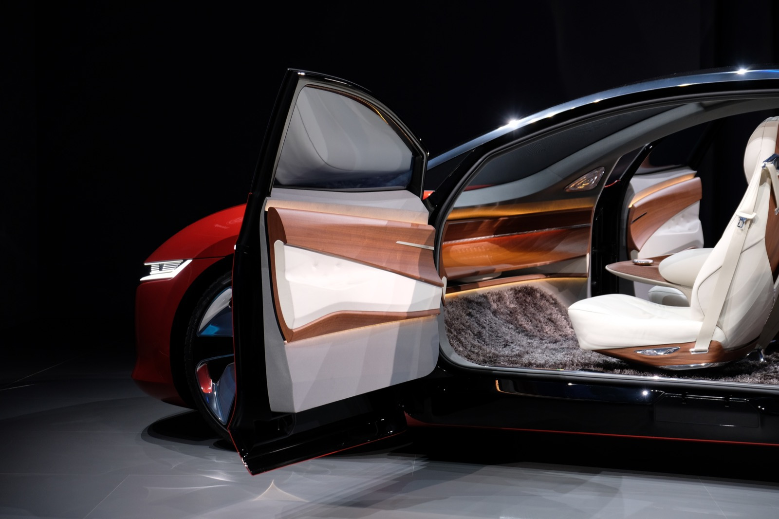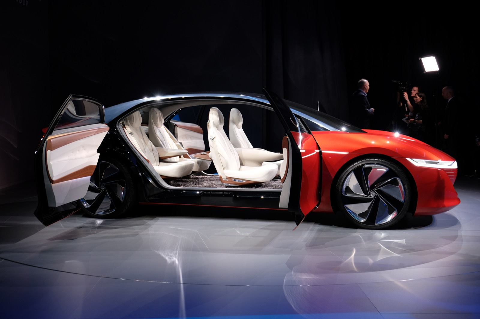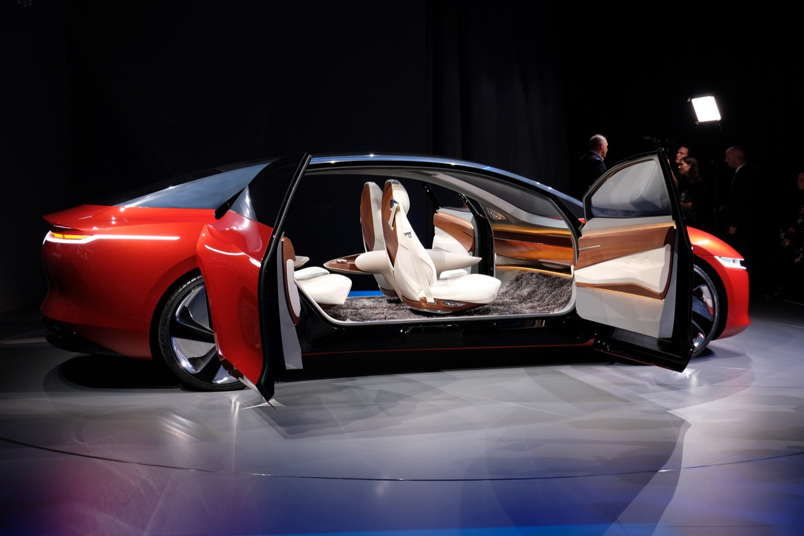 It’s a bit strange seeing a car with no visible dash displays and no steering wheel, brake or gas pedal, but most interesting is that the Vizzion still manages to look like a sporty car, one that you kind of want to, well drive. It has 302 HP equivalent from front and rear-axle electric motors, and a low center of gravity that can help it hug the road.
